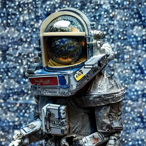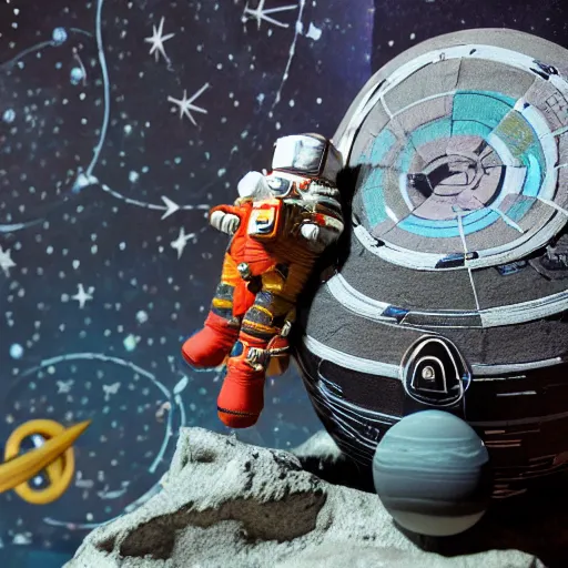 a space admiral tethered to an asteroid, with spaceship, space backdrop, everything made of papier - mache canon 5 d 5 0 mm lens, diorama, newspaper,