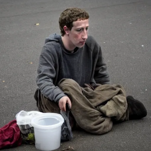 mark zuckerberg as a dirty decrepit homeless man begging for money, 4 k ultra high detailed