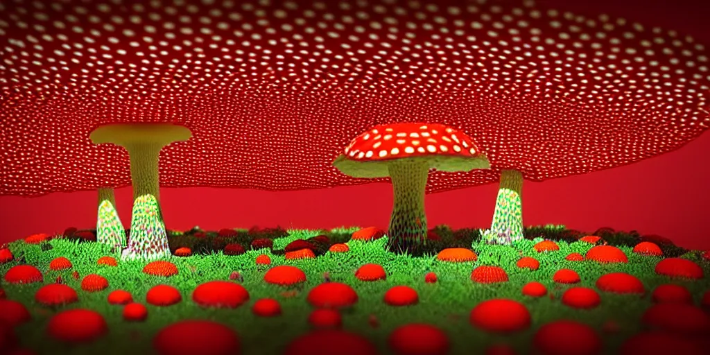 a 3 d render of a giant psychedelic amanita muscaria, many tiny people are below looking up at it,