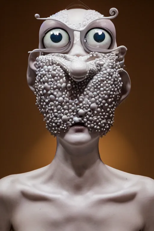 full head and shoulders, beautiful porcelain female person, mixed with three giant frog spawn eye...Show more