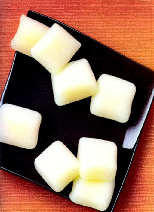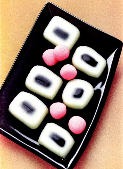 realistic photo of japanese mochi candies sweets, black and white, on a square wooden plate 1 9 9 0, life magazine photo