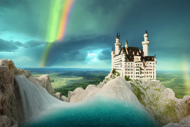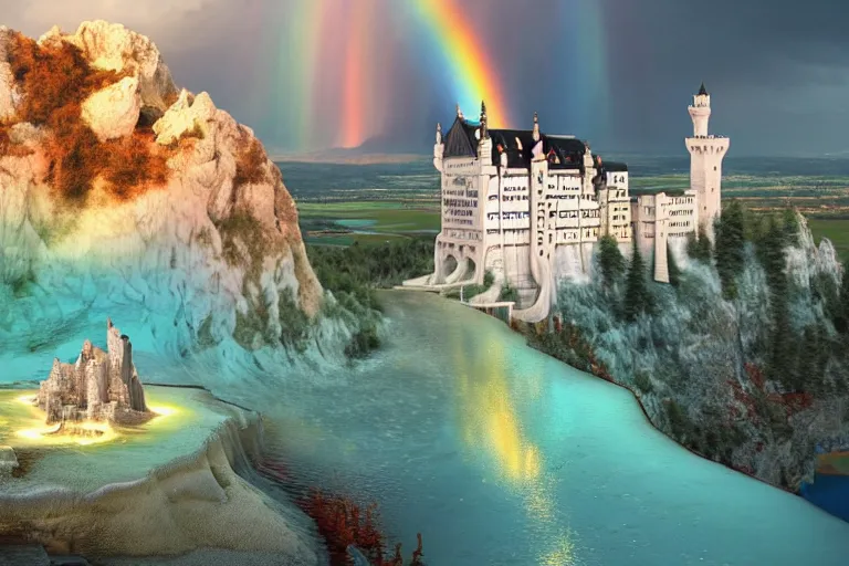 neuschwanstein castle on pamukkale thermal waters flowing down gold travertine terraces in royal...Show more