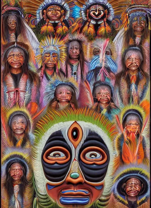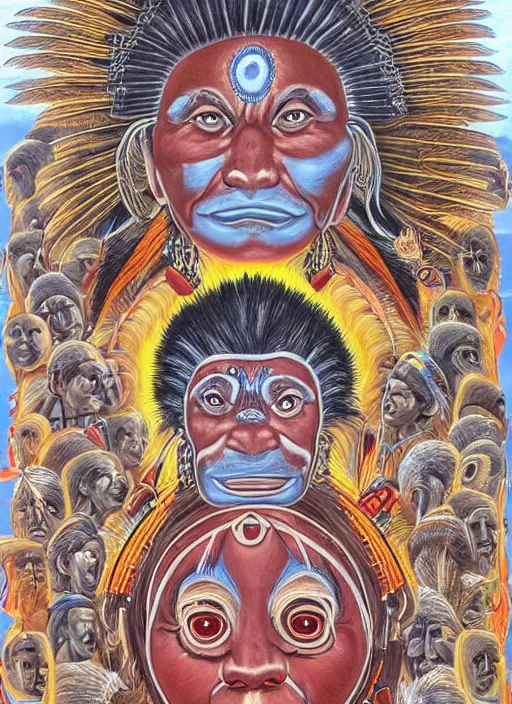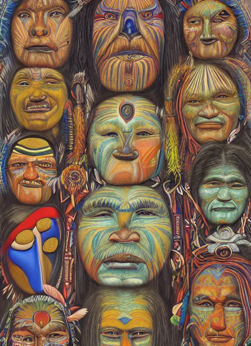faces of indigenous amazonian grandfathers and grandmothers spirits in the clouds, smiling, protection, benevolence, ancestors, detailed faces, symetrical, religious painting, art by alex gray