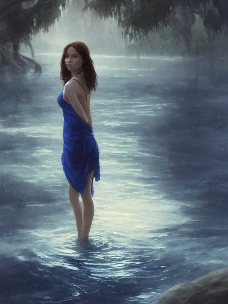 a vintage photo of one sad female standing in the river, gloomy, strong subsurface scattering, cobalt blue gemstones floating in the river, art by greg rutkowski
