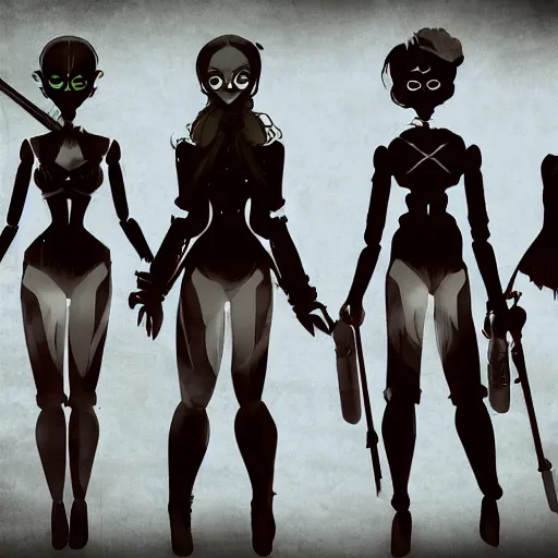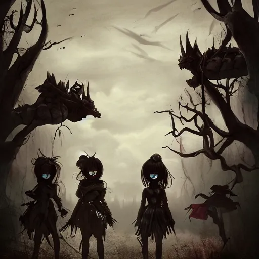 a group of menacing dolls approaching the silhouette of an adventuring party, trending on artstation, digital art, dark fantasy