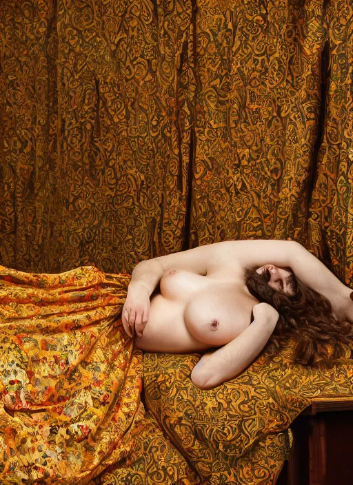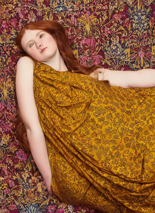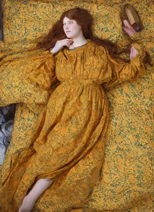 preraphaelite photography reclining on bed, big brown fringe, yellow ochre ornate medieval dress, william morris, 4 k