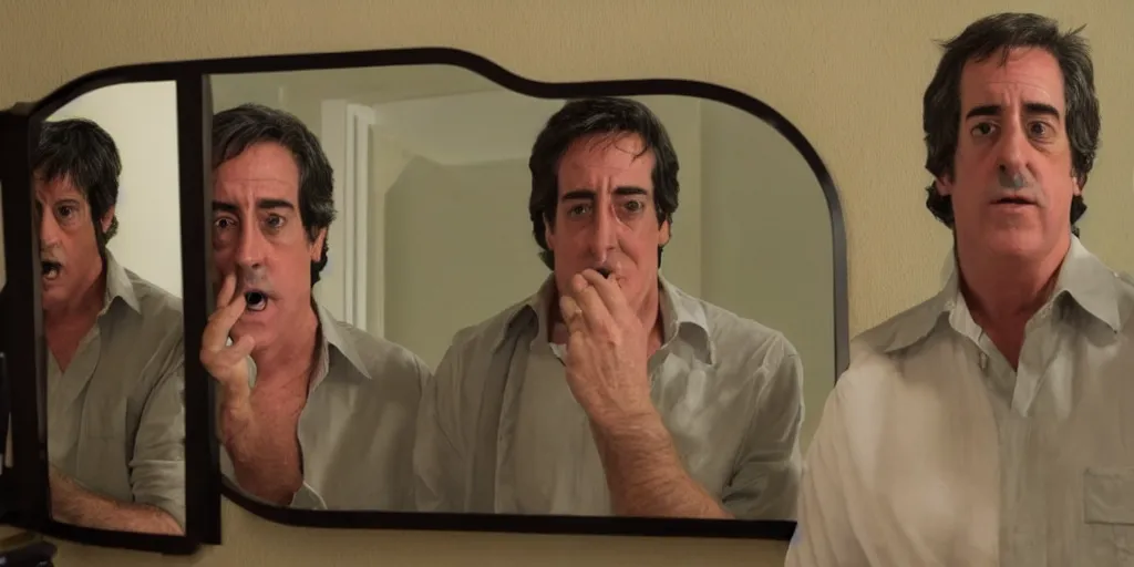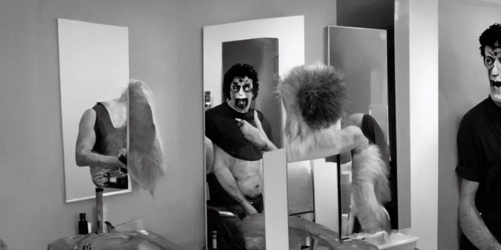david naughton, as david kessler from an american werewolf in london, looks at himself in a bathroom mirror to see his reflection as a monstrous wolf man, hyperreal, rick baker makeup