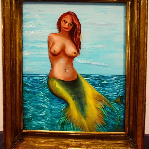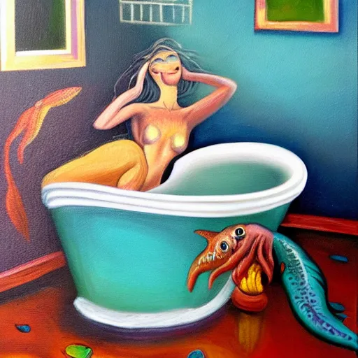 oil painting of a mermaid in a bathtub, gritty, small new york appartment,