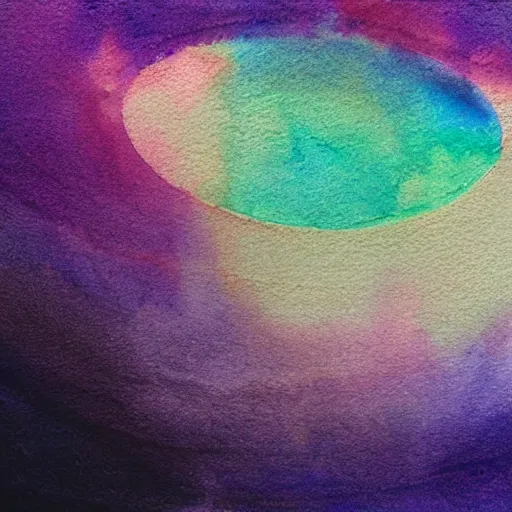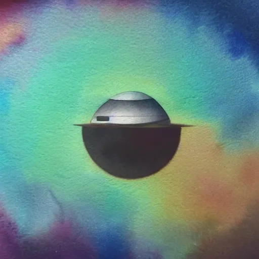 high - angle view, close - up portrait, vague uap interstellar vehicle on top of an ephemeral rainbow in the sky, muted watercolor. minimalist, detailed, heavy under paint, muted colors. ue 5