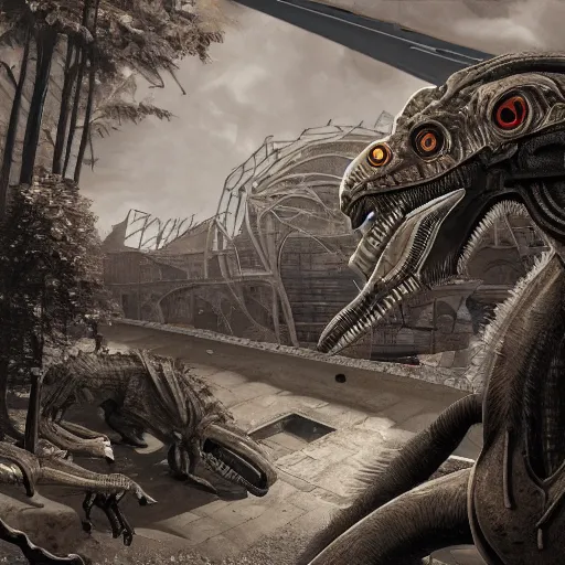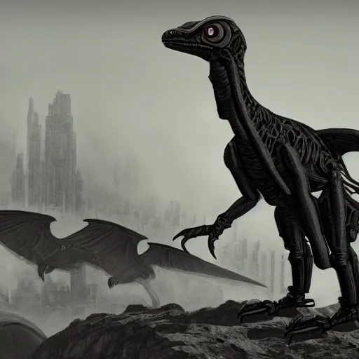 a detailed matte painting of a cyborg nazi velociraptor in nazi occupied france, 8 k, artstation, art in a noir crime novel style
