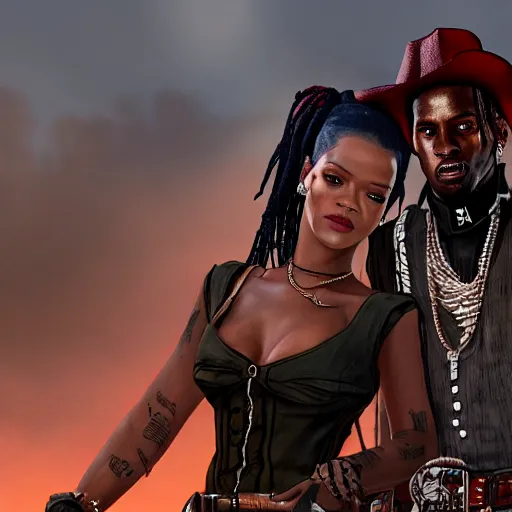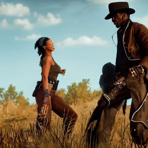 rihanna and travis scott in rdr 2, trending on artstation, hyperdetalied, realistic,