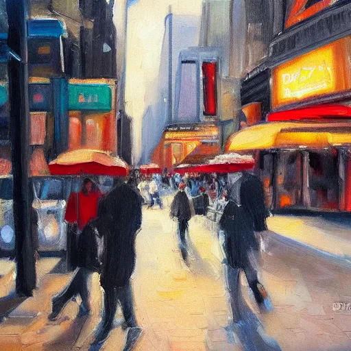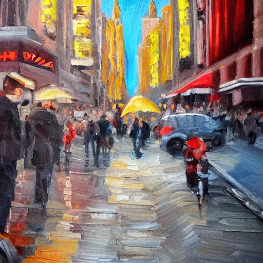 slice of pizza on a street in new york city, oil painting, very detailed, trending on artistation, desaturated, 4 k
