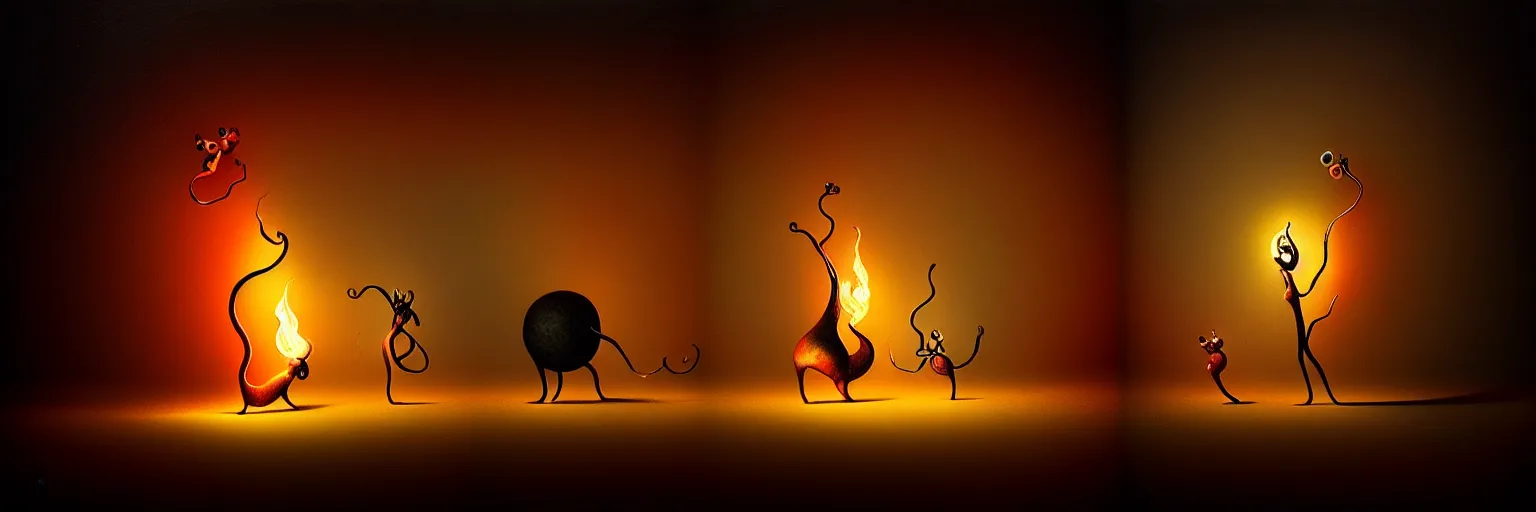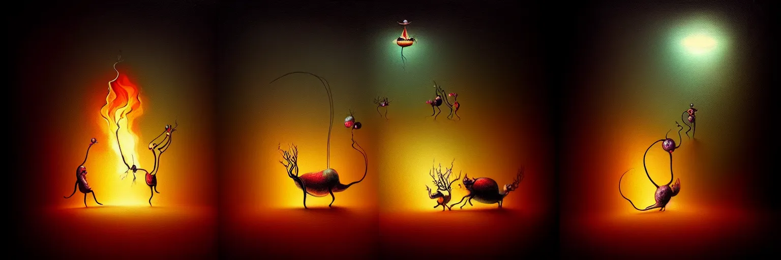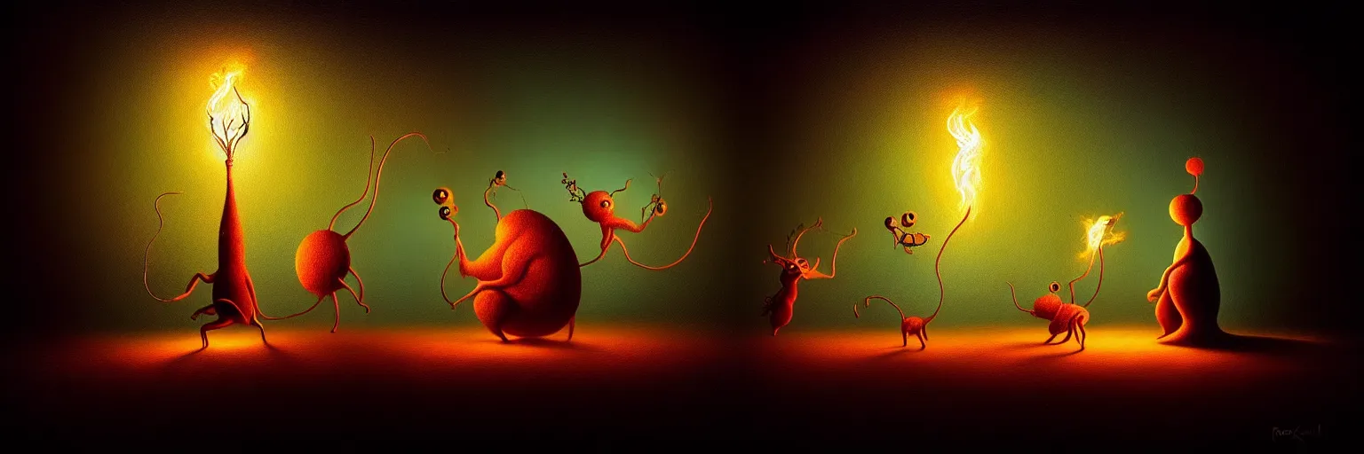 whimsical microscopic creatures from the depths of the mind, dramatic lighting from fire glow, surreal darkly painting by ronny khalil