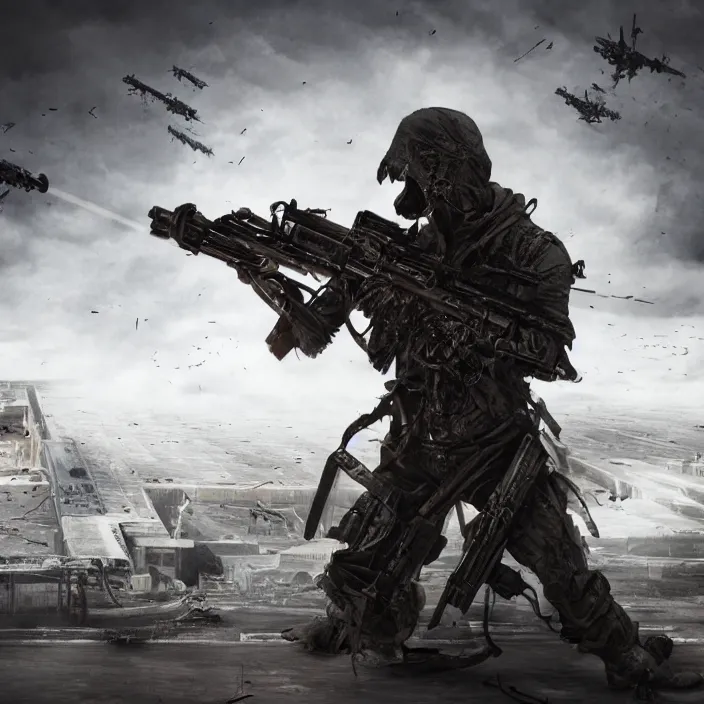 gritty hooded apocalyptic man firing laser - rifle in destroyed airport, hyper - detailed, smooth, sharp focus, 4 k ultra hd, fantasy dark art, apocalyptic art