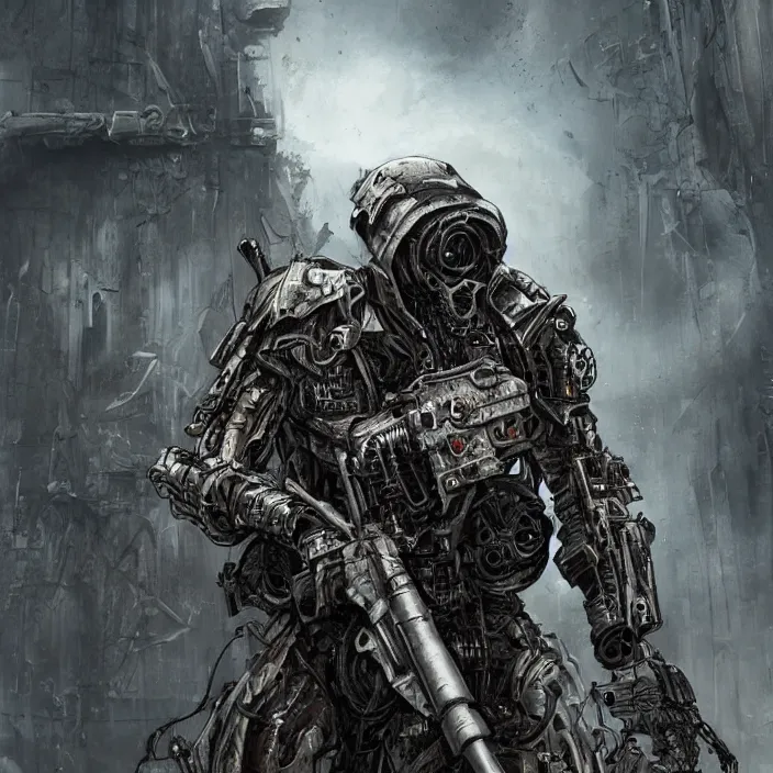 gritty hooded apocalyptic cyborg shouldering laser - rifle, destroyed machinery, hyper - detailed, sharp focus, 4 k ultra hd, fantasy dark art, apocalyptic art