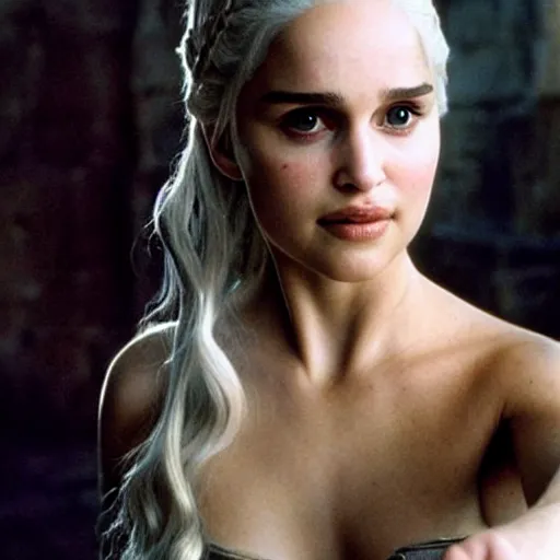 a selfie of daenerys targaryen played by a young natalie portman, smooth skin, light violet eyes, ethereal beauty, medium shot, detailed eyes, vivid, golden hour