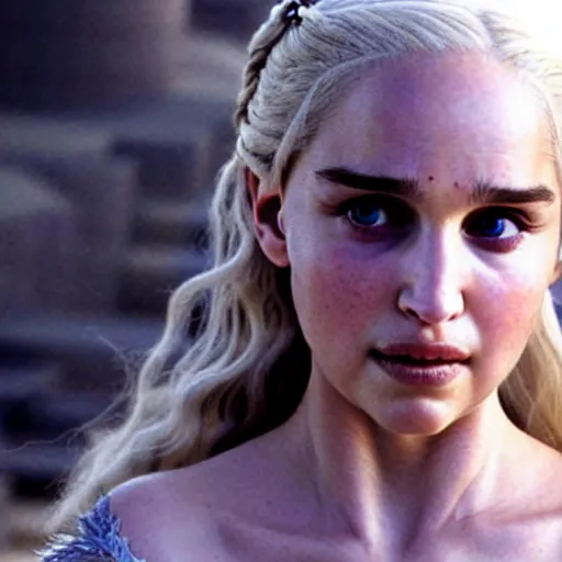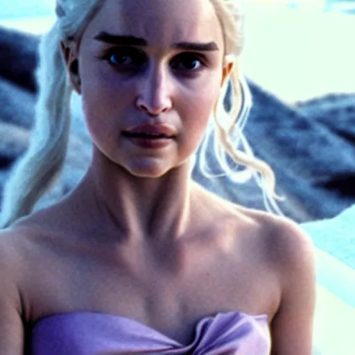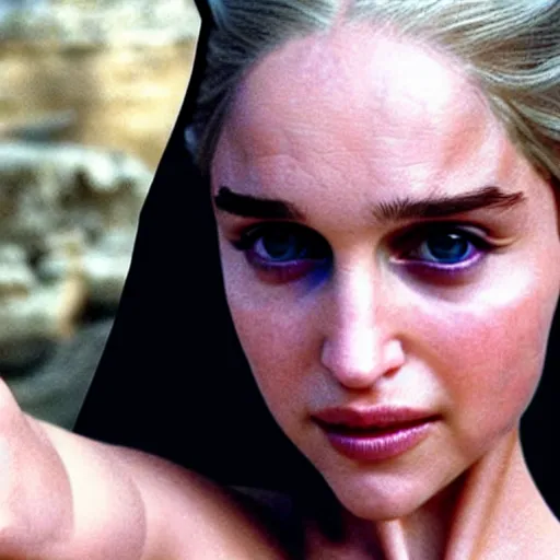 a selfie of daenerys targaryen played by a young natalie portman with smooth skin and light violet eyes, ethereal, mystic, medium shot, detailed eyes, vivid, golden hour
