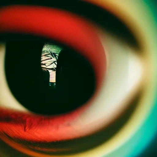 a closeup portrait of the eye of the goddess of introspection, extreme chromatic aberration, anamorphic bokeh, long exposure photography, film, distortion, highly detailed, hyperrealism, cinematic