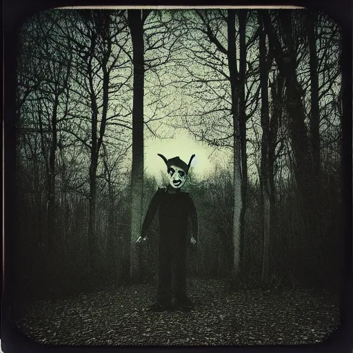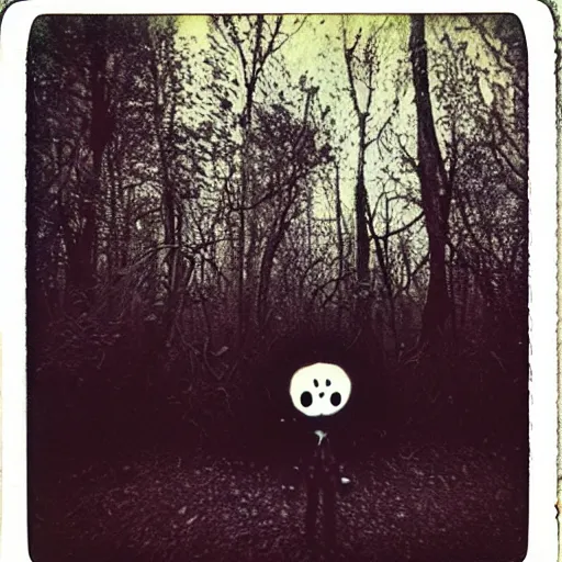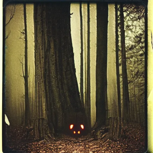 eerie polaroid of a creepy clown peaking out from behind a tree in a forest at dusk