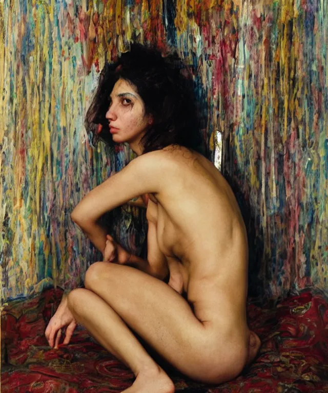 a color photograph of persian young woman in her home, by nan goldin, out of place, intense, bold...Show more