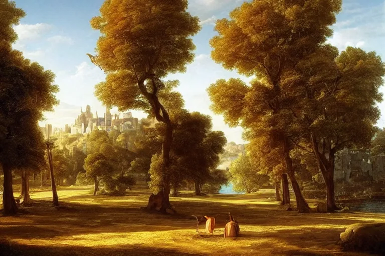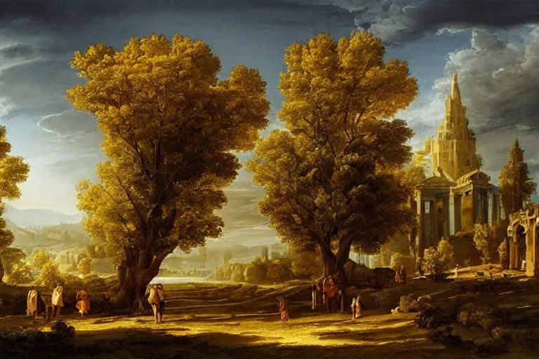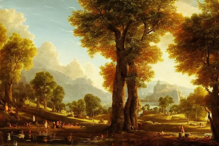 beautiful city landscape with oak trees, mythology, fantasy, landscape background, vivid colors, digital painting, very detailed, realistic, high quality, by claude lorrain