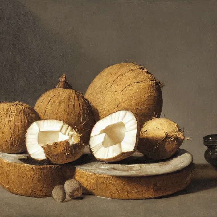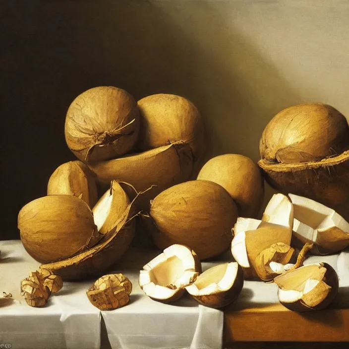 still life painting of halved coconuts by pieter claesz, oil on canvas, strong lighting, highly detailed, hyper realism, golden hour, god rays, hd, 4 k