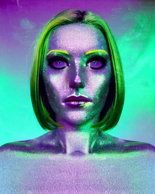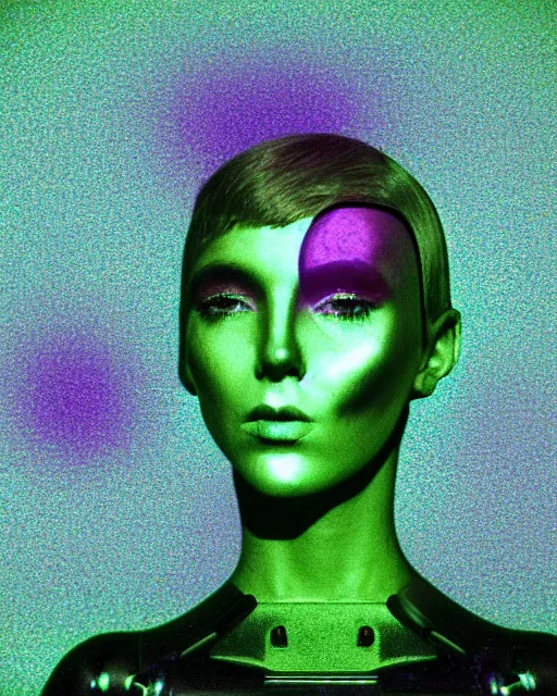 cut and paste, featureless surprised robotic woman's face, metallic bob hair, dark makeup, violet...Show more