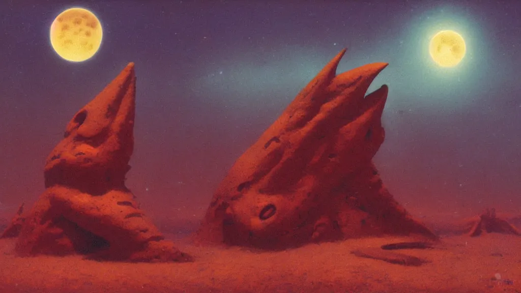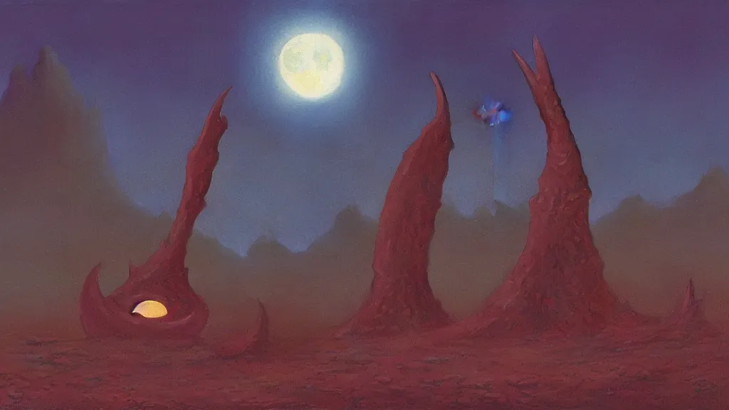 mysterious whimsical sculpture of an alien crescent moon by paul lehr and john schoenherr and john harris, cinematic matte painting