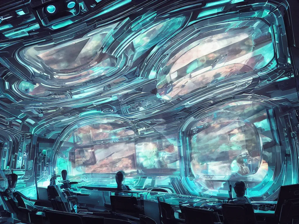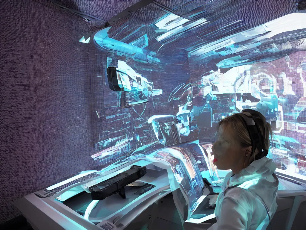 visor with curved translucent screens projecting detailed sci - fi art ( 2 0 4 2 ), pixel perfect photograph, high contrast, volumetric lighting, thin glowing lights, chair, users, pair of keys