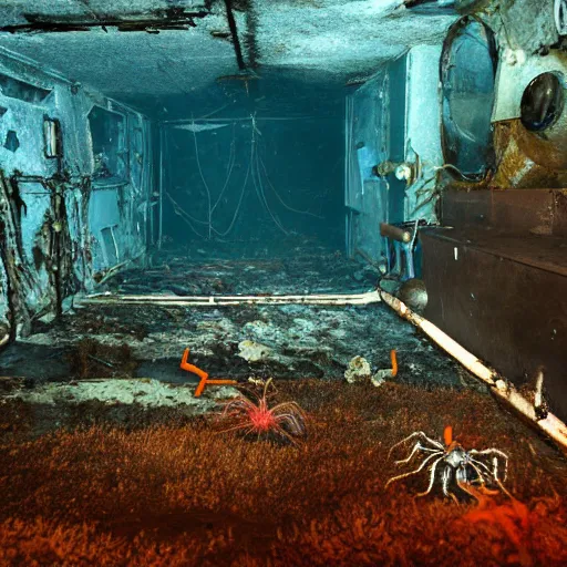 photograph inside of an abandoned soviet submarine underwater overrun with strange translucent spiders, wide angle, dry ice, decay