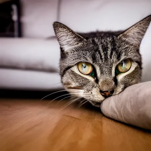 a curious cat staring at a fish eye lens camera on the couch