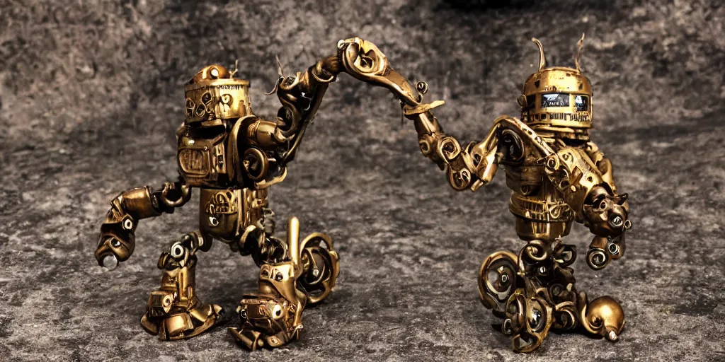 Prompt: a tiny cute steampunk dieselpunk monster with golden pistons and black belts and camshaft pulley and one small machine gun turret and one tiny missile launcher and one clock and one small jet engine and big eyes smiling and waving, back view, isometric 3d, ultra hd, character design by Mark Ryden and Pixar and Hayao Miyazaki, unreal 5, DAZ, hyperrealistic, Cycles4D render, Arnold render, Blender Render, cosplay, RPG portrait, dynamic lighting, intricate detail, summer vibrancy, cinematic, centered, focused, sharp