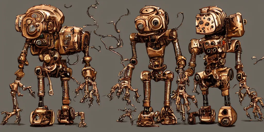Prompt: highly detailed victorian steampunk robot made of old electrical black and copper wiring, transistors, diodes, glass tubes, transistor parts, walking a dog on a leash in London, ornate, intricate design, hyperrealistic, 8k resolution, 3d render by billelis