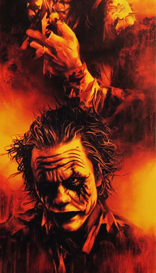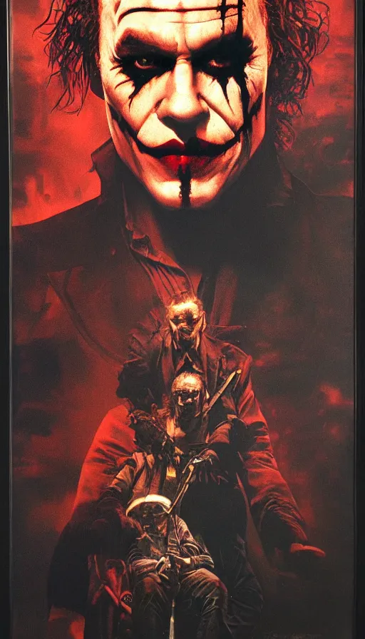 heath ledger's joker face close up on the apocalypse now poster, red sunset, snake river in the j...Show more