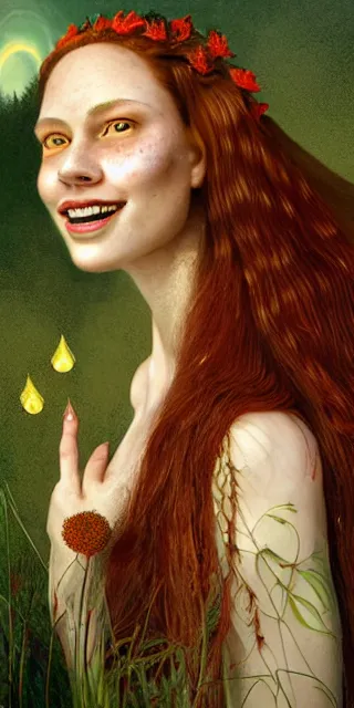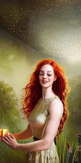 fit woman, serene smile surrounded by golden firefly lights, amidst nature fully covered by a int...Show more