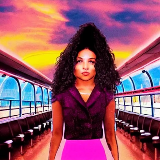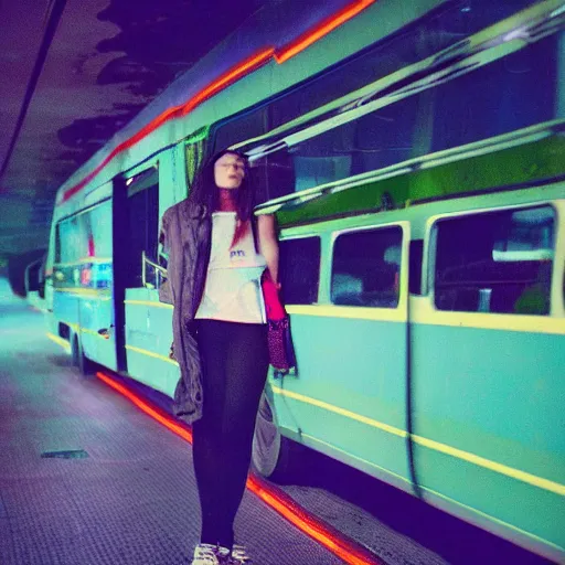 a young women, broken hearted, on a greyhound bus to find out where her love has been, nighttime, retrowave
