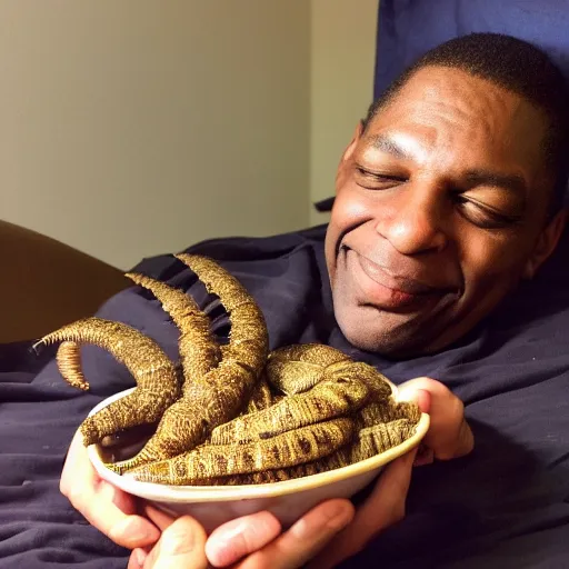 happy john coltrane snuggling a giant mealworm in bed