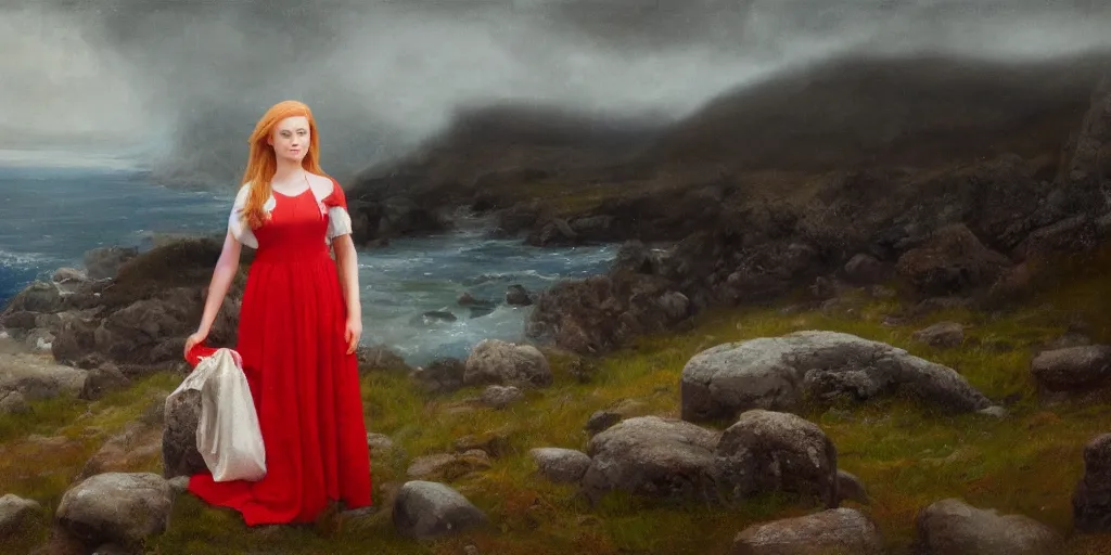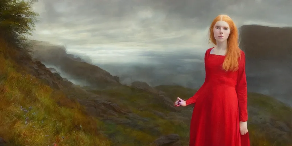a strawberry blonde haired teenage girl in a floor length irish style white and red dress stands...Show more