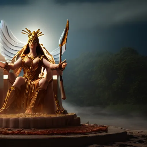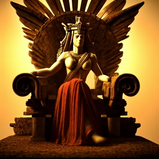 cinematic scene with the goddess of war sitting on a majestic throne, dramatic, small details, volumetric lighting, still frame