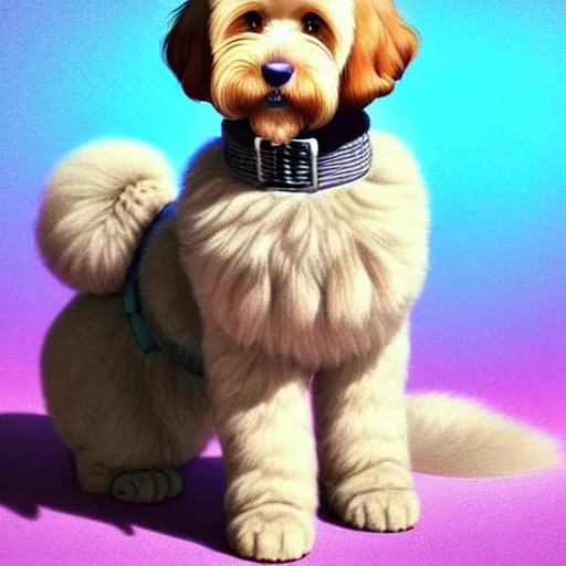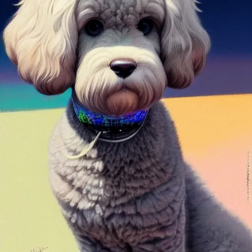 a cute goldendoodle with tilted head and a fluffy grey cat, focus close on eyes, eighties hologra...Show more