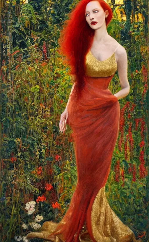 portrait of a woman with long red hair, very beautiful style, girl standing, in a gold dress, photorealism, against a winter garden, vanya comoretti,