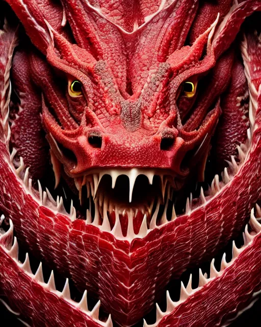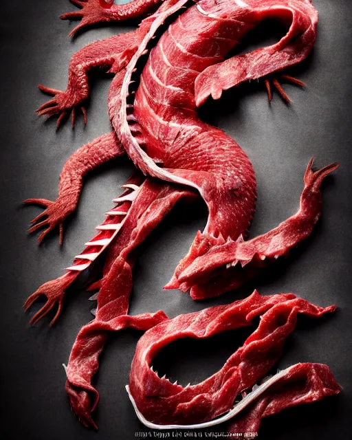 a dragon made completely of raw meat parts, realistic, photography, high definition, sharp focus, highly detailed, fine art
