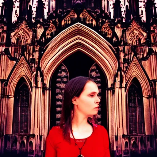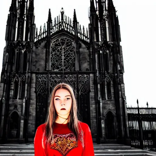 landscape gothic girl dressed in black, perfect face, macro head shot, behind her a gothic cathed...Show more