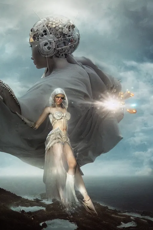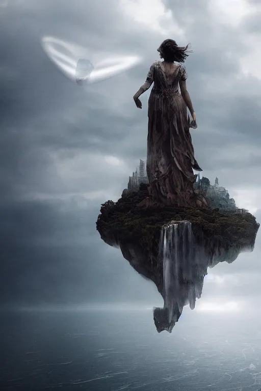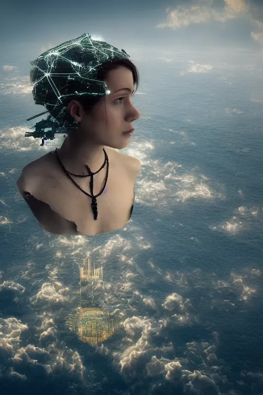 godess of artificial intelligence floating above a continent, sharp focus, by rozalski, cinematic, cinematic shot, megalophobia