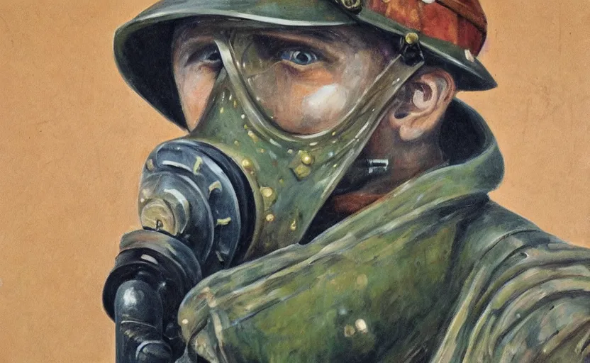 portrait of ww 1 soldier with gas mask, dripping paint fibonacci rhythm ar