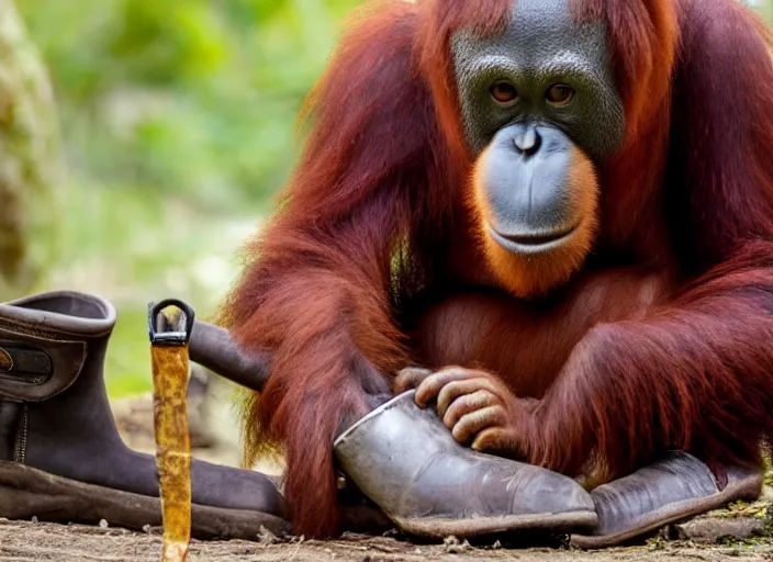 photo still of an orangutan eating a boot boot in mouth holding boot to mouth eating a boot!!!!! eating a boot!!!!!, 8 k