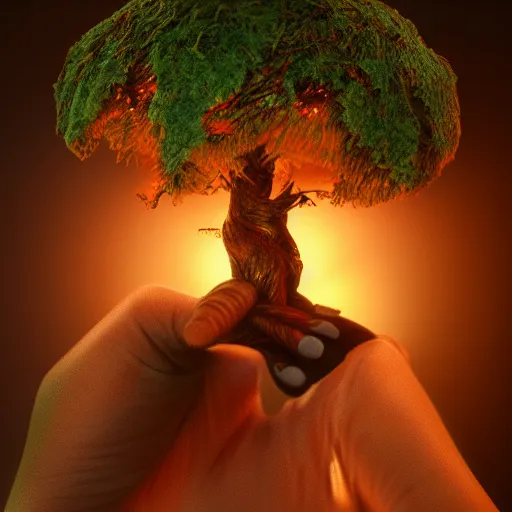 a life sprouting from dead tree, inside a lamp, over the palm of the hand, golden hour, volumetric lighting, octane, unreal 5, artgem, trending artstation, intricate digital art