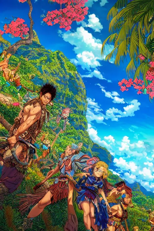 polynesian landscape, open sky. hyperrealistic anime background illustration by kim jung gi, colo...Show more