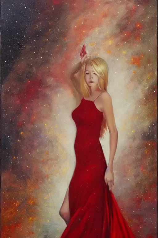 a blonde girl dressed in a long elegant red dress, texture, in a fantasy setting, starry sky, oil on canvas