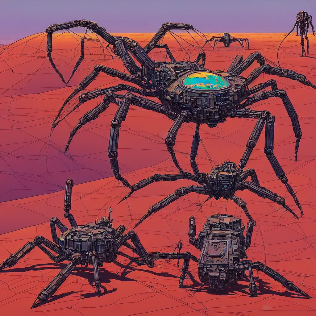 a painting of a giant mechanical spider in the desert, one character, fine art, intrincate, by moebius, jean giraud & kilian eng